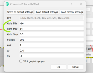 Our suggestion would therefore be to keep the “at CL = 0” mode but try to update the alpha range for the extreme flap angles before running XFoil from the GUI: