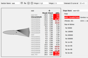 Our suggestion would therefore be to keep the “at CL = 0” mode but try to update the alpha range for the extreme flap angles before running XFoil from the GUI: